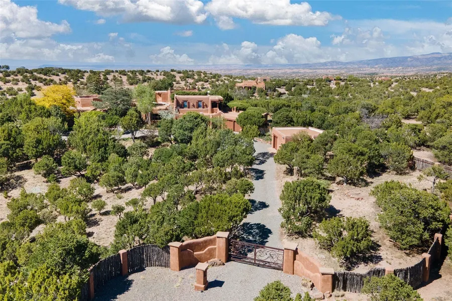 Perched in serene seclusion, this extraordinary estate embodies timeless New Mexico charm, offering breathtaking panoramic views from expansive rooftop decks and refined indoor-outdoor living. A lush courtyard leads into the heart of the home where artisan craftsmanship meets authentic Southwestern style. Curving adobe walls, Saltillo tile floors, carved wooden doors and kiva fireplaces echo throughout. The circular living room features a tiered beamed ceiling, kiva fireplace and intimate west-facing portal. The elegant dining room opens onto the courtyard creating harmony with nature. The kitchen flows to a covered portal with a built-in grill, cabinetry, dual sinks and ample seating-ideal for entertaining. A flagstone stairway leads to a luminous office with built-ins, powder room and rooftop deck. With stunning views of Sangre de Cristo sunrises and Jemez sunsets, this elevated open-air living space includes a kiva fireplace, bancos and a "crow's nest" retreat. The expansive primary suite offers a fireplace-side sitting area, access to a private garden with heated wading pool and outdoor shower and a spa bath with double vanity, soaking tub, steam shower and makeup station. Nearby flex rooms suit a gym, office or library. Two additional bedrooms-one with kiva fireplace and portal-share a beautifully appointed bath. A charming elevated casita includes a kitchen, full bath and mountain views. Meandering pathways wind through curated gardens, a koi pond, fenced garden with raised beds and potting shed, with many portals and patios. A 2-car garage with built-in storage and a separate third garage with a versatile studio and work sink round out the property. This exceptional estate is more than a home-it's a masterpiece of Southwestern living where art, nature and architecture converge in soulful, inspiring harmony.