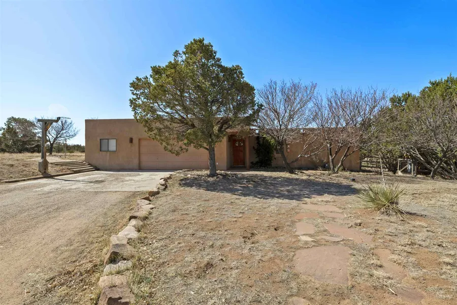 Originally built by Leif Backe, this home is perched on a 2-acre parcel slightly above the adjacent greenbelt. This location offers mountain views and outstanding access to trails and the Eldorado community school. This Eldorado home has special features to offer both inside and out including both PV solar passive solar. The floor-to-ceiling windows allow for an abundance of natural light in the central living area. The solidly rendered 5-bedroom, 3 bath structure features brick and tile floors, massive vigas and rustic Santa Fe elements. There is good separation between the main bedroom and the additional bedrooms and there is plenty of room for home offices and a home gym. Two courtyards offer large areas for leisure and play or just enjoying the views. The oversized two car garage has an adjacent workshop that could also function as a studio.
