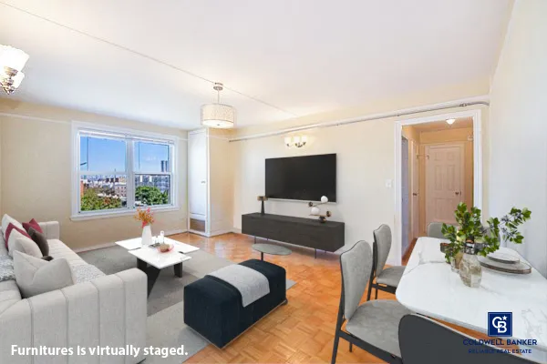 Must see this splendid two-bedroom home on the eighth floor of a co-op elevator building. This high-floor gem not only offers convenience but also provides breathtaking water views of the Manhattan skyline and the harbor from every room. The kitchen has been tastefully renovated, featuring granite countertops, exquisite chestnut wood cabinets, creating an inviting space for your culinary adventures. The renovation includes an updated electrical system along with the windowed bathroom to suit your aesthetic senses.