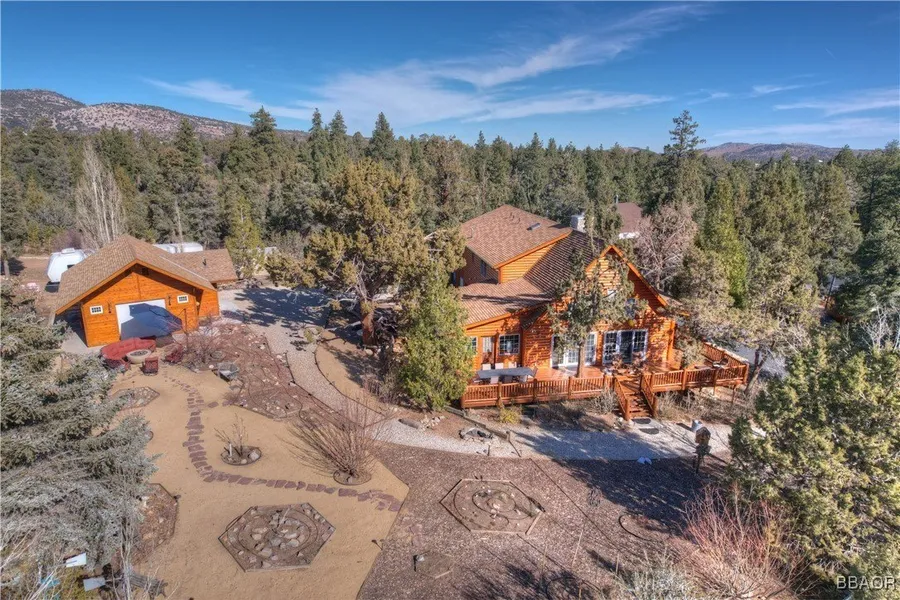 Exquisite estate in exceptional condition! This custom log style home features an impressive great room with full log beams, a bright sunroom, four spacious bedrooms, and 3 bathrooms. The interior boasts a dramatic design, fit for a magazine feature. This estate provides complete privacy, with several spaces to relax and take in the natural beauty. Perfect for the buyer seeking a unique, high-quality home with character. Featuring remote control blinds and ceiling fan lights. Two FAU, 2 A/C's, 2 water heaters for up and downstairs. Kitchen features a walk in pantry and stainless steel appliances. The master suite has a deck to enjoy, a large walk-in closet, and an expansive bathroom. Owned solar electric system and on grid. In addition to the two-car garage with pull thru, a separate one car garage or workshop is a dream mancave, complete with electricity, water, and its own bathroom and there's a covered carport for added convenience. Step outside to enjoy breathtaking views and low maintenance, yet beautifully landscaped surroundings. Enjoy the charm of decks surrounding the home, including a covered front porch. Situated on a gated 31,000 sq. ft. lot, this property is surrounded by other expansive properties and neighboring homes.