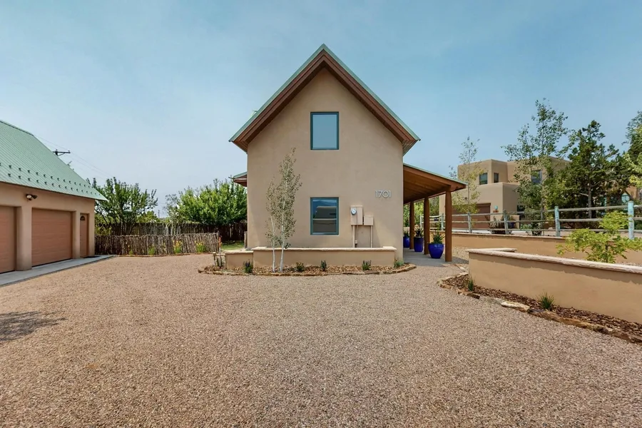 Smartly updated, Northern New Mexico Style, passive solar home. First Energy Star home in New Mexico featuring high quality construction and outstanding efficiency! Inside you will find stained concrete radiant floors, new high-quality carpet upstairs and an abundance of beautiful natural light throughout the home. Tasteful finishes have been newly added to the kitchen and baths including new quartz countertops, sinks, matching faucets, lighting accents as well as brand new Wi-Fi ready Samsung Stainless Steel appliances. Other recent updates include a Lutron wireless automated lighting system, new smart smoke/CO detectors and thermostats, Moen Flow water leak detection system and a filtered drinking water system. Feel at ease with brand new radiant heat boiler and control system as well as new domestic hot water heater. The home enjoys lovely Sangre de Cristo Mountain views from the primary upstairs bedroom with walk in closet. Outside you will find copious parking for guests and toys. The extensive low maintenance landscaping surrounding the property brings a pastoral feeling with blue grama, Aspen trees and flowers amongst artful custom stone walls all automatically watered with a Wi-Fi controlled irrigation and drip system. The detached 580 sq/ft heated, insulated and finished garage could easily serve as an excellent workshop, studio, or guest house. The garage also boasts a full, equally sized attic for extra storage or the option to finish. This would be a great location for the LANL commuter or someone looking for an ultra-convenient location just minutes from Plaza, the Railyard, and the Montanita Co-op. Enjoy a very short walk to the river trail, Frank Ortiz dog park and city open space trails, or a quick mountain bike ride from this home to La Tierra trails and more. This home offers easy connection to all that Santa Fe has to offer!