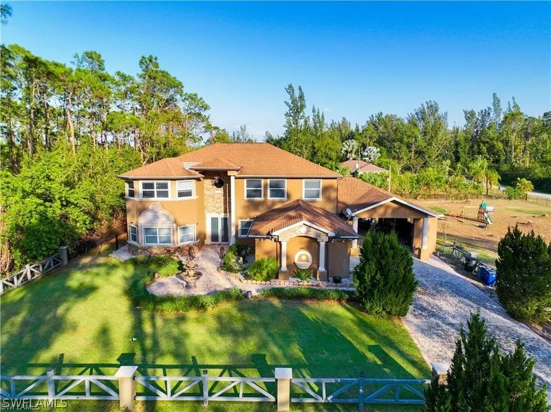 Stunning beautiful estate located in Lehigh Acres! This fully furnished 4,800 sqft home sits on an acre lot with multiple upgrades and custom-built features. 5 Bedrooms + Den with 3 full bathrooms. One bedroom and bathroom on the ground level. Home theater room and large