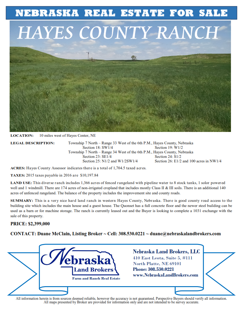 SUMMARY: This is a very nice hard land ranch in western Hayes County, Nebraska. There is good county road access to the building site which includes the main house and a guest house. The Quonset has a full concrete floor and the newer steel building can be used as a barn or for machine storage. The ranch is currently leased out and the Buyer is looking to complete a 1031 exchange with the sale of this property.