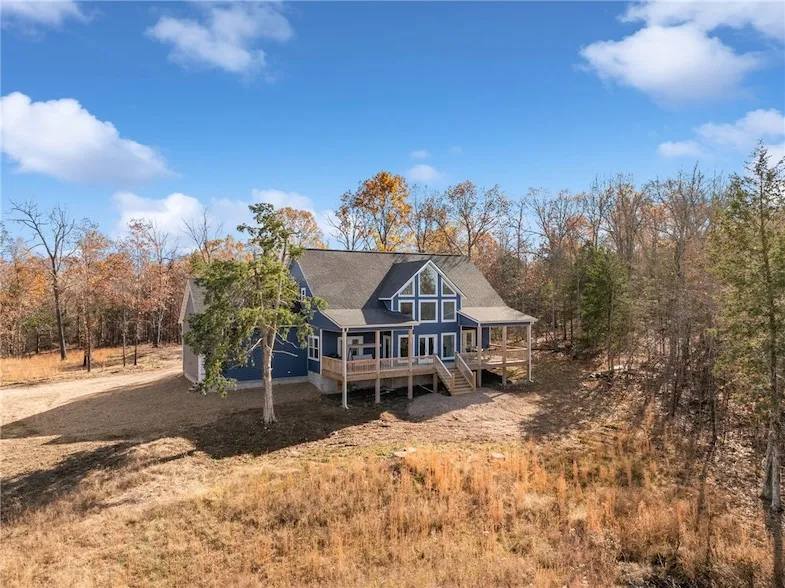 Introducing a luxurious lakeside retreat: This stunning 3-bedroom, 2 and 1/2 bathroom home on nearly 8 acres boasts captivating lake views from every angle. Step into elegance with high-end finishes and modern amenities throughout. The tranquil blue exterior blends seamlessly with the serene surroundings, offering a peaceful oasis. Inside, discover open floor plan, high end kitchen appliances, and expansive windows. Relax in the private master suite overlooking the private outdoors. Enjoy outdoor entertaining on the expansive deck or take a stroll to the lakefront. Experience lakeside living at its finest in this meticulously crafted, blue-hued sanctuary.