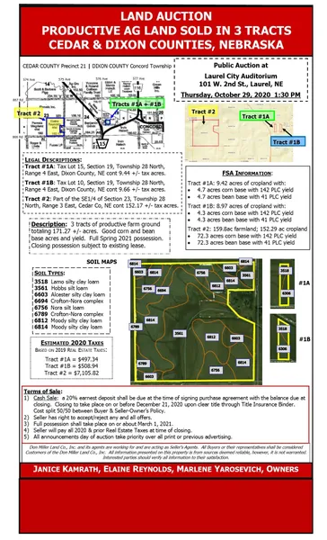 3 tracts of productive farm ground totaling 171.27 +/- acres. Good corn and bean base acres and yield. Full Spring 2021 possession. Closing possession subject to existing lease.