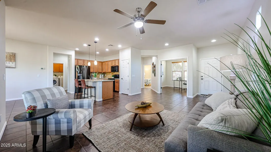 Welcome to this charming 2-bedroom, 2-bath home with a versatile den/flex room, perfectly situated in the highly desirable 55+ community of CantaMia. From the moment you arrive, you'll love the inviting curb appeal with low-maintenance landscaping, mountain views, a private enclosed backyard, tons of shade, and a cozy front courtyard -ideal for morning coffee and friendly chats with neighbors. Enjoy peace of mind and lower utility costs with a fully owned solar system that saves approximately $800 per year! Inside, the open-concept great room welcomes you with warm tile flooring, abundant natural light, and a seamless flow into the kitchen and dining spaces. The kitchen is a true delight with granite countertops, natural wood cabinetry, and a spacious eat-in area that opens to the to the backyard for effortless indoor-outdoor living. The primary suite offers a relaxing retreat with ample space, dual sinks, and an oversized walk-in shower. Step into the screened-in Arizona room for year-round comfort - perfect for unwinding with a book or entertaining guests. The private enclosed backyard is thoughtfully designed for both relaxation and gatherings, featuring an extended paver patio, pergolas for added shade, and a firepit for those cooler desert evenings. Living in CantaMia at Estrella is about more than just a home - it's a lifestyle. Enjoy resort-style amenities including indoor and outdoor pools, state-of-the-art fitness centers, scenic walking paths, lakes, pickleball courts, and countless clubs and social activities. Experience the best of active adult living, where comfort, community, and Arizona's natural beauty come together in perfect harmony.