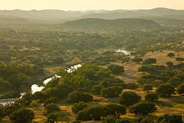 The landscape showcases the Hill Countrys topography including low rolling hills and deep canyons. Salmon Peak and Boiling Mountain, the two highest peaks in the area, are located on the property, providing challenging hiking. Live oaks and juniper ensure the view is evergreen. In the process of strategically removing cedar, ranch staffers have uncovered cultural treasures ranging from dinosaur tracks to Native American cave art.