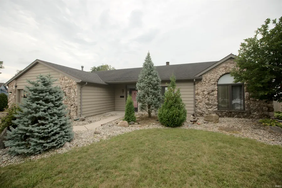 Welcome to Pine Valley and our recent price alignment... This charming ranch features a stone accent exterior and mature landscaping that create a warm first impression. Step into the generous foyer and be greeted by a large great room with cathedral ceilings, a stunning stone fireplace, built-ins, and access to a large patio overlooking a park-like backyard. Adjacent is a spacious dining area with a 5-window bowed section, seamlessly connected to a U-shaped kitchen with ample cabinets, a pantry, and new stainless-steel appliances. Enjoy a separate laundry room, a generously sized owner's suite with a wood-beamed cathedral ceiling, private patio, and privacy-fenced yard, plus an updated furnace and AC from 2020. The garage offers plenty of storage, a partially floored attic, and removable carpet protecting the ceramic tile in the kitchen, owner’s bath, and foyer. Don’t miss the chance to make this delightful home yours!