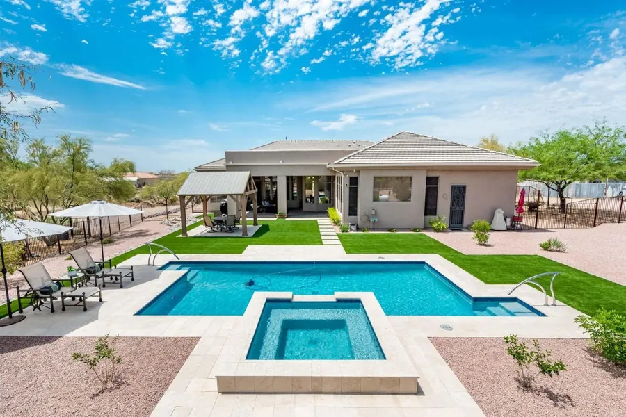 This stunning luxury property has a fabulous mountain-view setting and includes almost three acres, two parcels and a newly completed resort-style pool, heated spa and ramada! Located at the end of a quiet street, home has four bedrooms plus office/den and terrific split floorplan. Light and bright with beautiful wood plank tiled flooring and huge great room. Kitchen has cherry wood cabinets with slide outs, newer stainless appliances, gas cooktop. Large laundry/mud room opens to extended 3-car garage. This parcel is being sold as one of two parcels, the second of which has a horse set up. The second parcel is 211-66-149 for a total of 2.7 acres. They will be sold together. Three outbuildings included plus a steel Conex cargo container. City water AND a shared well on this property.