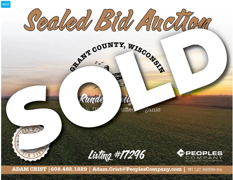 Grant County, Wisconsin Land Auction - Peoples Company is pleased to present the sale of 173.31 surveyed acres of prime organic Grant County, Wisconsin farmland. The Runde Family Farm was first homesteaded in 1961 and has not been publicly available for over 50 years. With long, straight rows, rich soils, and excellent hard-surfaced access off Kirkwood Road, this farm will make a highly desirable add-on to an existing farming operation. The primary soil types on these tracts include top-producing Tama Silt loam, Fayette silt loam, and Dodgeville Silt loam. 17.90 previously enrolled acres in CRP (Conservation Reserve Program) have been removed from the program and are eligible to be farmed for the 2024 cropping season.