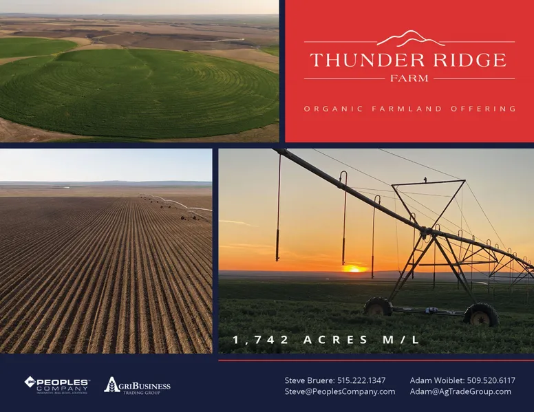 The Thunder Ridge Farm is located in the Horse Heaven Hills of Benton County, Washington less than 10 miles from the Columbia River and the Washington-Oregon border. The Farm is comprised of 1,742 assessed acres m/l. The property consists of 1,183 certified organic cropland acres with an additional 233.53 acres re-enrolled in the Conservation Reserve Program through 2030. In addition, the Thunder Ridge Farm also includes a DNR lease totaling 50.5 acres of which 48.3 acres are authorized to be irrigated with water supplied from DNR water right no. G4-22435P. Primary soils on the property include the productive Warden Silt Loam and Finley Sandy Loam. In addition to the productive, fertile soils, the Farm has extensive water rights that authorize 901 acres to be irrigated through two wells, 20 well-maintained irrigation pivots and an extensive network of mainlines. The water delivery system is telemetrically controlled offering remote access to the irrigation infrastructure on the Farm. With the productive soils and extensive water rights and infrastructure, the Farm has supported numerous organic crops over the years including primary crops such as alfalfa, corn, and wheat along with numerous specialty crops such as potatoes, onions, sweet corn, and carrot seed. These combined characteristics make this farm ideal for continued success in organic production.