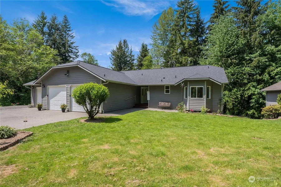 3016 Sqft Daylight Rambler with Multigenerational living quarters in the daylight basement. This home sits on beautiful 9.5 +/- acres with a 3 car attached garage and 2 car detached Shop/Garage with lower level storage. NO HOA. Recent updates include Luxury vinyl floors, paint, carpet, and countertops. The main floor consists of; a primary BR with a 5-piece bath, secondary BR, and full Bath. The lower level features a rec room, kitchenette, 2 more BR, an office, workout space, and 1 full bath. . RV parking, dump, and power as well. Home includes heat pump and is wired for a generator. Less than 10 minutes to downtown Granite Falls and 20 minutes to Arlington.