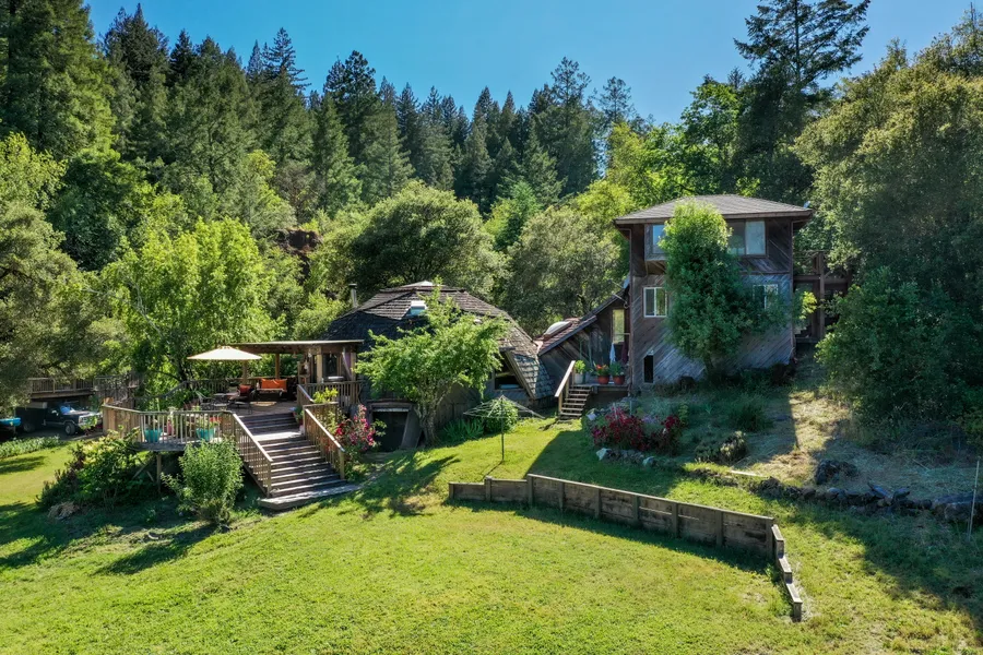 Let the stress of the day slip away as you cross your bridge to your own private sanctuary. This magical setting on 23.68± acres is serenity embodied yet only 9± minutes to Healdsburg Plaza. A 1/4± mile of Mill Creek borders this private property that contains hillside pastureland, redwoods and oak forests. The ever-changing falls start just downstream from the bridge and cascade over magnificent boulders to the pools below. Stroll out to the hillside pasture past a small pond with croaking frogs or relax on your back deck and watch the birds. The property includes a 2108± sq. ft. residence with many custom finishes and a detached office, shop and carport. In the kitchen are beautiful custom-made red oak cabinets, Bubinga hardwood countertops, a Blue Star 6 burner stove with convection oven and an Abakka mirrored stainless custom range hood. Entertain your friends in this original open concept home and in the evening with no conflict from city lights, count the stars.