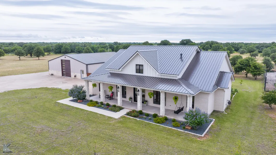 Experience the ultimate luxury of country living in this secluded and privately gated estate featuring an impressive modern farmhouse nestled on 44 Acres of breathtaking land including 16 acres of Arizona Bermuda surrounded by mature oaks! This better than new custom built three-bedroom, two bath home showcases cathedral ceilings in the living, highlighting the floor to ceiling stone fireplace remotely operated for warmth and ambience and expansive windows creating a sense of grandeur and openness. Fall in love with the chef's gourmet kitchen equipped with Taj Mahal quartzite countertops, white oak custom cabinets, dual induction ovens and a farmhouse sink, complete with luxury vinyl plank flooring throughout. Designed for entertaining, the sprawling island and spacious dining provide plenty of room for guests. Stunning primary ensuite boasts recessed ceilings with a true spa-like bath including dual vanities, a massive walk-in tiled shower with dual heads and a fabulous walk-in closet with an abundance of built-ins. Immaculate craftsmanship is evident throughout. Within the 50*60 foam insulated Dream shop features 2 automatic garage doors and a 1000 sq ft guest living quarters with a safe room. Full RV setup with connections and separate septic. Impressive 4000 sq ft garden with water. Enjoy the evenings relaxing on the spacious covered patio overlooking the most serene setting with captivating views and tons of wildlife. Back-up generator ready, so no outages! This is a showstopper!! Contact Chelsea Pemberton at 325-518-2134