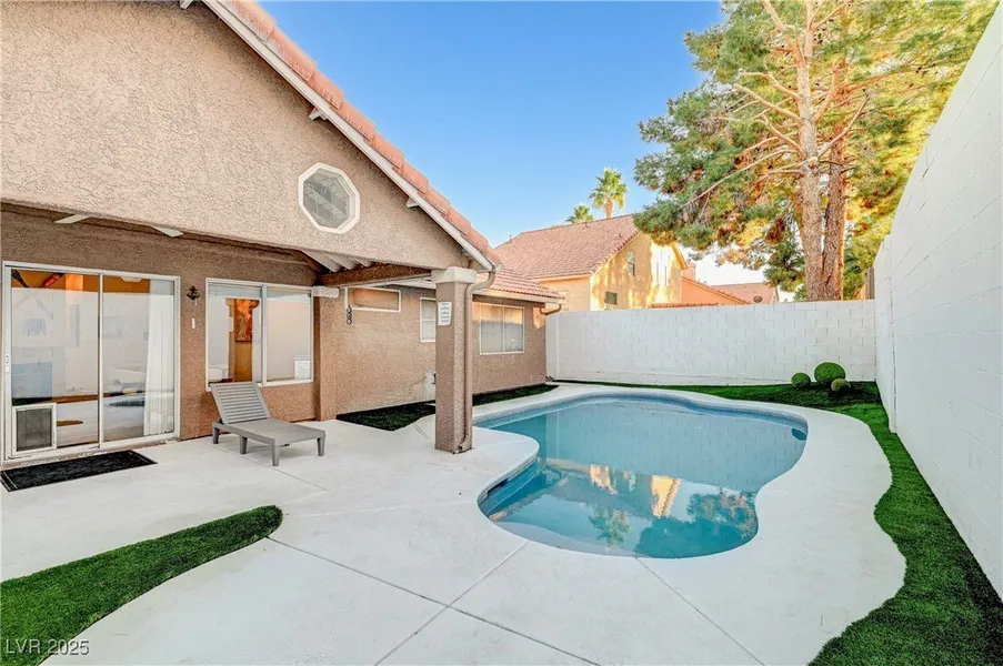 This beautiful single-story home in Henderson offers bright, spacious living areas with high ceilings and tile-finished bathrooms. The open-concept primary suite features a generous bedroom, large bathroom, and walk-in closet. Enjoy low-maintenance desert landscaping in both the front and backyard, plus a pool and patio area perfect for outdoor living.