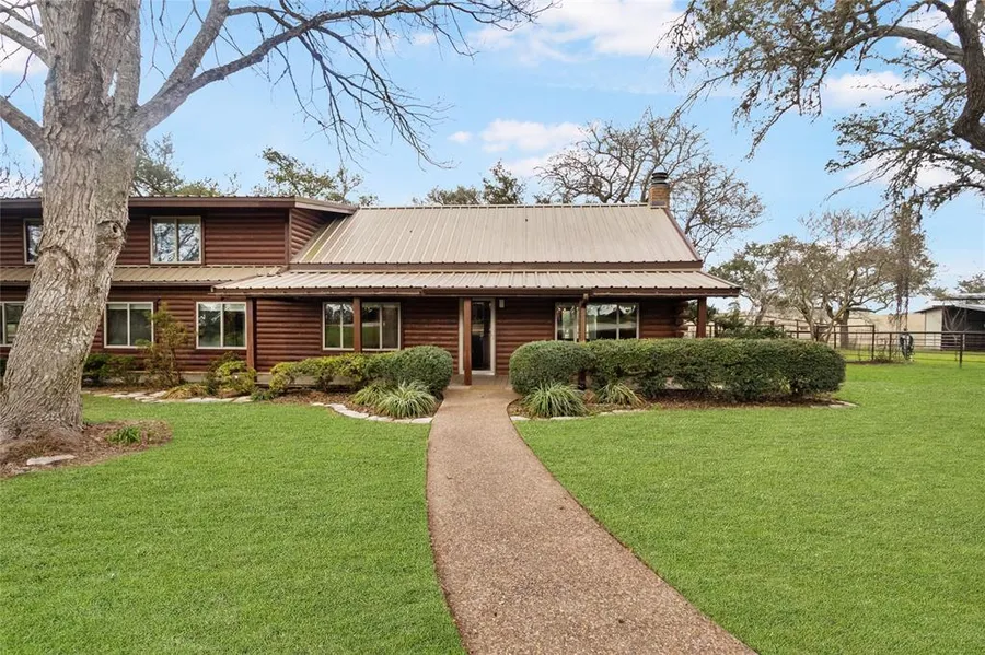 Rustic, well-kept, open concept TRUE log cabin home. Walk into an open gathering space w/an ample kitchen with custom cabinets, dining space & abundant living area. 2 spacious rooms & well appointed bathrooms complete the downstairs area. Upstairs you will find a perfect space for a home office or workout area. Relax in the evenings on the large porch & under the beautiful oaks. Spacious 3 car garage & energy efficient metal roofs on all buildings. The property is cross fenced complete w/pipe fencing around home. This property is loaded with potential & ready for your livestock/hay needs. 40x60' barn with 30' lean can house all of your equipment, a 50 amp RV hookup is a convenient bonus. 20x30' equipment barn and 40x40' covered area are ready to store feed & hay for livestock. Loafing shed w/tack room is ready for your horses/cows. Improved 15 ac. hay field yielding 100+ 5x5' bales per year. Conveniently located 45 mins to Victoria, w/in 2 hrs of Austin, San Antonio & Houston.