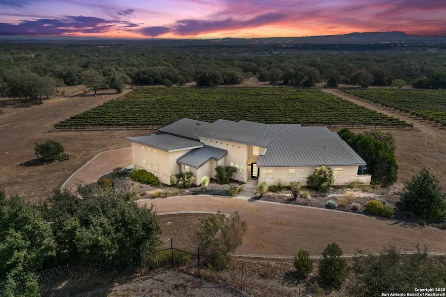 A rare opportunity awaits! This 12 acre, end of the road Hill Country retreat w/views for miles & its own award winning mature vineyard is now on the market. Energy efficient 3100 square foot single level home w/spray foam insulation, metal roof, heat pump HVAC system, well and rain harvest tanks, tankless water heater, Anderson windows and GE monogram appliances is an open floorplan w/wood & tile floors throughout. A split bedroom layout. Master bedroom offers a cathedral ceiling & private bath w/large soaking tub & walk-in shower. Two ensuite secondary bedrooms w/full bath & 4th bedroom is adjacent to the hall bath. Open kitchen/dining area w/walk-in pantry plus a separate wine room w/250 bottle storage. The beach entry pool w/spa tub & 30' wide outdoor living space features a built-in grill, frig, fireplace & retractable shades - all overlooking the vineyards. There is also a firepit and seating area in the back yard. A 30x50 barn on the property also has an efficiency apartment (not included in square footage shown in ML system). Appointment require for all showings - no sign or lockbox on the property.