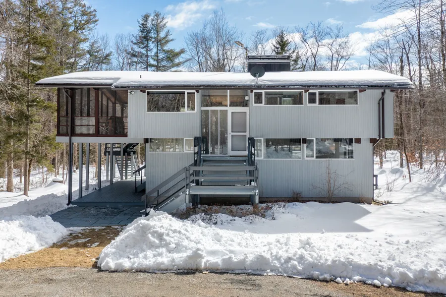 CLASSIC NEW ENGLAND DECK HOUSE ON 8.9 ACRES OF PRIVATE WOODLANDS! Mid-century inspiration meets cutting edge interior design in this 2084 sq ft deck house. Floor-to-ceiling glass looks out upon sun-filled decks, uninterrupted forest, and early American stone walls. Classic deck house elements - such as post and beam construction, soaring ceilings, and walls of glass - allow for a bright and contemporary aesthetic. An updated (but maintaining period character) kitchen with Bertazzoni refrigerator, spacious screen porch with Italian handmade terra cotta tile, large living room with wood fireplace, and primary bedroom with en suite bath constitute the upper level. Downstairs, one finds two sunny bedrooms, den with fireplace, and a full bath.