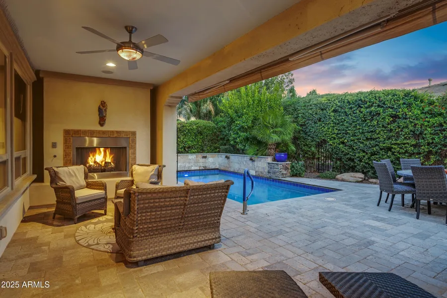 Experience luxury resort-style living in this immaculate St. Tropez 2BR/2BA home featuring owned solar panels for exceptionally low utility bills! The private, professionally landscaped Italian-inspired backyard is an entertainer's paradise with a stunning pool featuring waterfall ,bench seating w/spa jets, elegant travertine decking, built-in BBQ station, and cozy gas fireplace. Inside, discover exceptional upgrades throughout: rich hardwood floors, premium granite countertops, stainless steel appliances, beautiful upgraded alder cabinetry, and spa-like bathrooms with custom tile work. Located in Arizona's premier Encanterra Country Club offering championship golf, pools, restaurants, art classes, pickleball courts, and vibrant social activities for the ultimate active lifestyle.