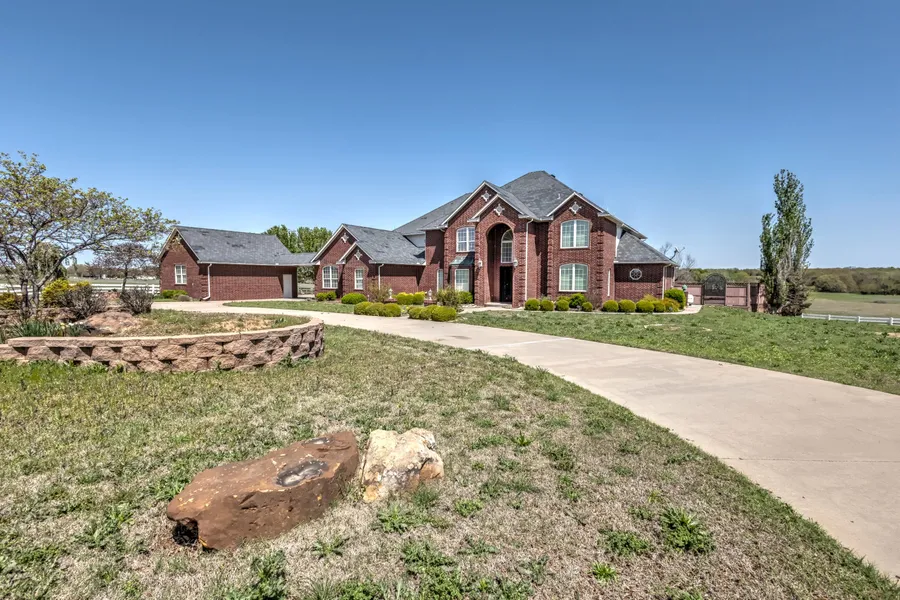 Custom one owner home built in 2003. The home consists of 4,639 sq ft featuring 4 bedrooms, 3 baths and 1 half bath situated on 5 full acres. (mol) 2 car attached garage with an additional 2 car detached garage/shop. The custom kitchen is a dream with a built in refrigerator and walk in pantry. Granite counter tops and tons of cabinetry. The primary living area has a custom rock fireplace and features incredible 20ft ceilings with floor to ceiling windows and custom plantation shutters. The laundry room doubles as a mud room. Designated office space facing West for tons of natural light, built in desk, cabinetry and shelving. This home has a bedroom downstairs with En Suite. The 2nd living area has a tiled floor with doors leading from the pool, which makes it a perfect flex space for snacks out of the full bar and fridge area .This area is perfect for a pool table or lounge area and can be closed off from the rest of the home for pool parties. The Grand foyer features a custom wrought iron and wood stair railing leading upstairs. The front entry Wrought iron and glass Renaissance double opening doors have opening glass inserts and create the perfect air flow throughout the home. The primary bedroom has new Sherwin Williams Evergreen Fog paint, large windows with plantation shutters and opens to an amazing En Suite with double vanity, walk in shower and 28 jet Jetta brand jacuzzi tub. Private lavatory. This room also has a private balcony overlooking the outdoor pool area. The pool is concrete and is surrounded by TREX decking. This home has a water softener with filtration system, 2 HVAC units and a 105 Gallon hot water rust proof tank. Underground garage tornado shelter. Additional land is available with this property. Current appraisal in hand.