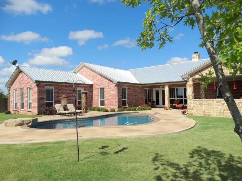 Wonderful 2014 custom built (by Tommie Harendt) hilltop home on 70 acres with additional acreage available. Featuring a beautiful sparkling pool with outdoor top-notch kitchen including a propane grill, rotisserie, griddle, 2 burners, Egg smoker, small fridge and sink in serving bar. Nothing spared in this home with gourmet kitchen, granite countertops, 2 islands, 6 burner stove & grill, SS appliances, ice maker, drawer warmer, double ovens, RO unit & softener. Hand scraped hickory wood floors are beautiful in the open living room with rock fireplace and wall of windows overlooking backyard. Beautiful views out front office of hills. Hunt, fish or graze on this rolling terrain with 3 ponds, Mesquite and Oaks. 40x50 insulated and heated shop, inside storm shelter & half bath, greenhouse and chicken coup.