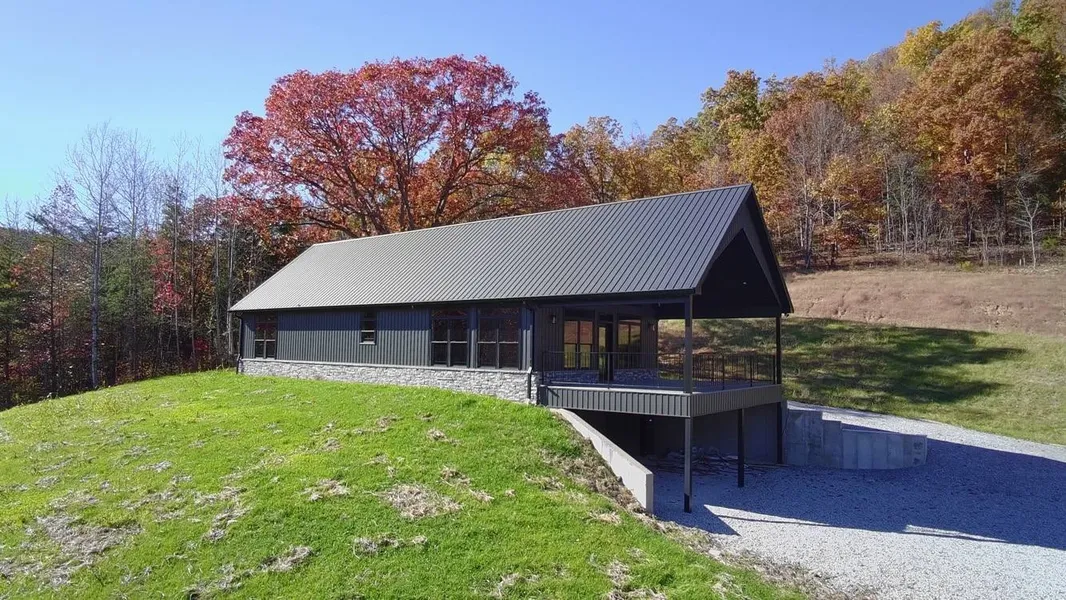 HOME - GET AWAY - LODGE all in one. Can be purchased as home & 77.4 acres m/l. (Tracts #5 & 6). Brand New Home with all the extras including granite, wood floors, cathedral ceiling and high ceilings, a true custom build. Home has open living room - dining - kitchen with the large living room having a 20 ft. tall wood cathedral ceiling, opening up onto a 16 x 26 concrete elevated porch, modern kitchen with all stainless appliances and ding area. Primary suite with large bedroom - spacious tile bath with granite - walk in tile shower - walk in closet w/ utility area, 2 additional bedrooms with tile hall bath, plus 2 car carport. Home has a full basement with metal clad finished walls. Ideal get away, mostly woods with great hunting and trails. Located 1775A Fisher Creek Road