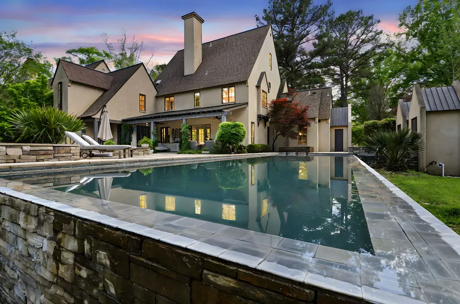 The main-level primary suite is a private sanctuary, complete with a spa-worthy bath featuring a steam shower and direct access to the infinity pool. Concrete pavers add durability and style to the main floor, while the upper level showcases heart pine floors for warmth and character.