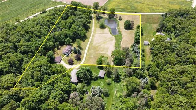 Privacy! Nature! Views! 4 bedroom, 2 bath home nestled on 9 acres of land. Nice private entrance with a pond when you come home! Sit on your deck out front to enjoy the scenery or head to the patio to enjoy the wooded area and overlooking the pond. This home has lots of natural light with all the windows! Formal dining area has French doors to the great room with a wood fireplace. Split bedrooms with 2 full baths upstairs. 3 car detached garage and another 1 car detached garage for projects.