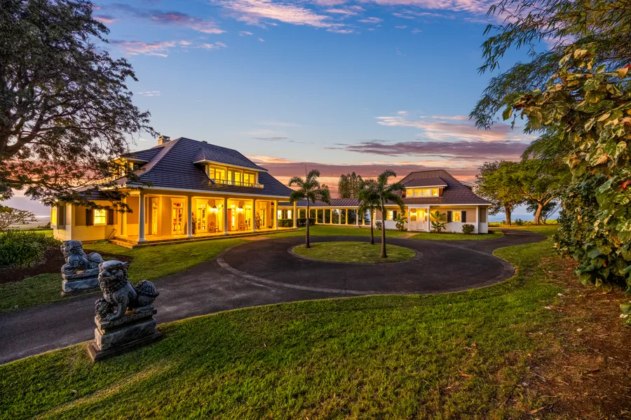 Welcome to this stunning 4.2-acre estate in Sunnyside, nestled between Makawao and Paia towns. This property seamlessly combines timeless design, exceptional craftsmanship, and unmatched privacy. Inside, the home features rare O’hi’a lehua hardwood floors, elegant trims, and thoughtfully designed lighting. A durable foundation reinforced with structural I-beams and a wildfire-resistant aluminum roof (installed in 2017 with a transferable 50-year warranty) ensure lasting peace of mind. The grounds are equally impressive, with a terraced front yard, a west-facing lawn offering spectacular sunset views, and a gazebo with ambient lighting—perfect for relaxation and entertaining. Additional structures include a modern art studio, a spacious 3-car garage, and a cottage with kitchen, bath and laundry, ideal for guests or family. A gardener’s paradise, the property thrives with a lush orchard featuring Meyer lemons, oranges, coffee, bananas, and more, alongside a vegetable garden. Naturally nourished by gentle rains, the land is perfect for cultivating produce.