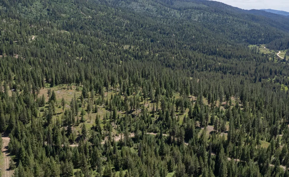 The lush green canopy of trees stretches as far as the eye can see, with a well-maintained dirt road winding through the landscape, providing easy access to various parts of the property. The forested area is ideal for hiking, wildlife observation, and enjoying the tranquility of the great outdoors. Additionally, the property borders Forest Service Land, giving this property a much larger feel and expanding your exploration and recreational opportunities.