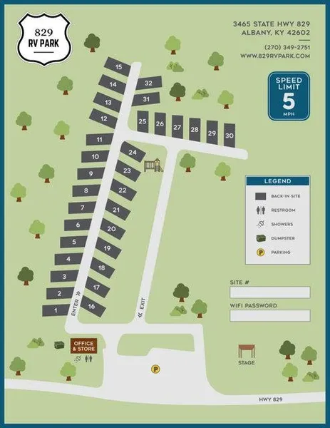 829 RV PARK TURN-KEY business opportunity! 829 RV Park is a newly developed RV Park in Albany, KY with 32 sites up and running! Created in 2023, this RV park has (32) 40X50 full hook-up gravel sites, including electric, water, septic and wi-fi, with 30 or 50 amps. (24) of these sites are transient for overnight, weekly, or monthly guests. (8) are annual sites that have their own electric meter. Phase 2 has been approved by the state and will offer the ability to add 18 additional sites. There is a 200 sq ft finished office building onsite for check-in and sales, which includes 2 showers and a private office. A new dog park is also on the property. With over 18 acres, only a fraction of it is currently developed. There is so much potential for future development. This would be a great area for storage buildings, tiny houses and/or cabins and cottages.