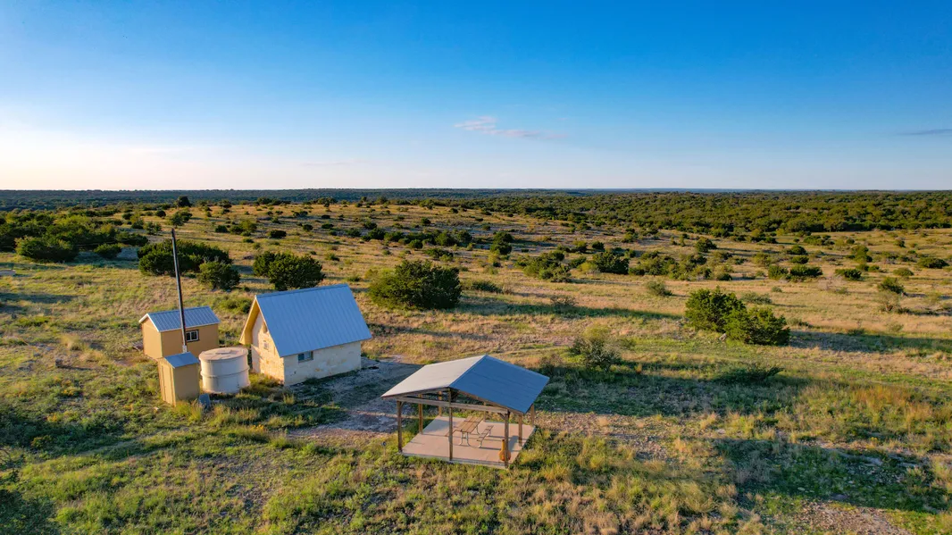 The improvements include a one-room bunk cabin with limestone exterior and metal roof. This little cabin is perfect for the buyer not wanting the maintenance of a large home. A storage shed for tools and supplies is on-site and convenient to hold everything needed to take care of the property. There is also a pavilion with a picnic table that has electricity ran to it. The 330-foot-deep water well and 1,800-gallon water storage tank are in place and well maintained.