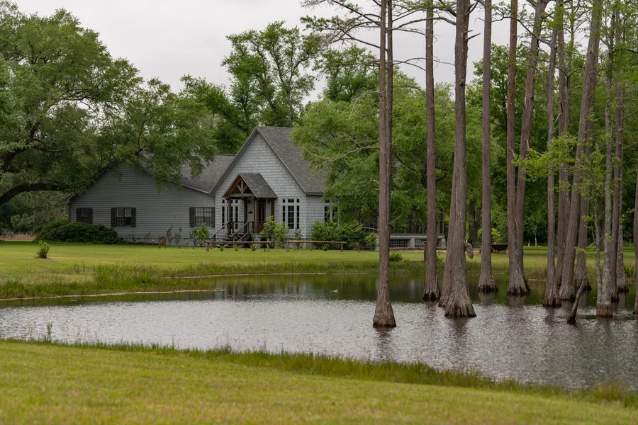 The main lodge is nearly 5000 sq.ft. with 3 bedrooms, all with private baths and 2 additional half baths - one located in the gun room/study and the other is located just off of the bar/den area. The classic dog-trot layout of the lodge is ideal for entertaining family/friends or to conduct informal business meetings. The dog-trot lay out has the bedrooms on two corners of the home and the third and fourth corners used as kitchen/formal dining room and gun-room/study and climate controlled wine storage respectively. The dog-trot central section of the home is an informal den that features a stone two sided fireplace flanked by over an stuffed leather couch/chairs and many plantation art pieces and antique furnishings. The den opens into the recently constructed section of the home that consist of a bar and 1400 sq,ft. entertaining hall that boast cathedral ceilings with exposed custom milled wooden beams and custom milled wide plank wood floors. The fireplace in the hall was built using old coble stones pulled from the streets of Birmingham Alabama and serves as a central focus and gathering point.