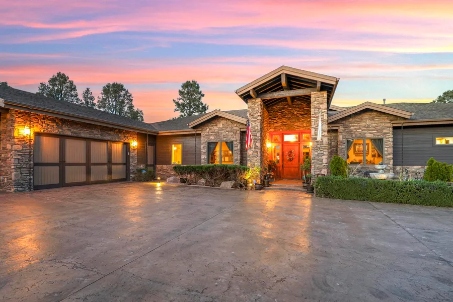 Step into this exquisite single-level residence, thoughtfully designed with no interior steps and breathtaking mountain views. The inviting entryway opens to a spacious great room, showcasing floor-to-ceiling wood-clad windows, large beams, vaulted ceilings, high ceilings, Eight foot solid wood doors, and a cozy gas fireplace adorned with rock accents. Dual ceiling fans enhance the ambiance, while the expansive windows flood the space with natural light and uninterrupted views of the mountains. This home boasts a gourmet kitchen featuring a gas cooktop, convection microwave, a large oven, two dishwashers, a central kitchen island, and an abundance of storage, including a walk-in pantry. Enjoy casual meals at the breakfast bar or in the eat-in dining area, or entertain guests in the formal dining room. The well-insulated home offers privacy with a split floorplan. The primary suite includes a fireplace, ambient lighting, and direct access to a covered patio. The spa-like bathroom features a soaking tub, a spacious walk-in shower, and an expansive walk-in closet. There are three additional bedrooms. One bedroom has its own full ensuite and access to the patio, while the other two share a connected bathroom. One of these bedrooms is currently being used as a versatile office/bedroom combo. Storage is abundant throughout the home. The oversized garage accommodates three vehicles and a golf cart. Outside, you'll find a beautifully landscaped entrance with a small courtyard and water feature, while the backyard offers a stamped concrete patio, fencing with gates, and a drip irrigation system for easy maintenance. This home blends comfort, style, and functionality. Schedule your appointment today and make it yours!