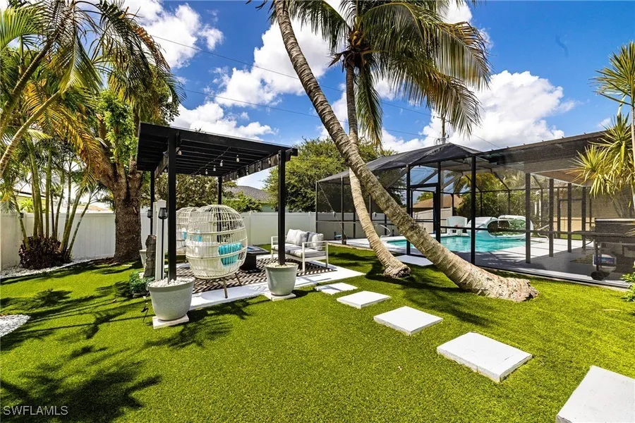 Don't miss this pet & kid friendly tropical oasis! Live in paradise in the highly desirable SW Cape Coral, FL. Soak up the sun daily under the screened in Pool or out under the coconut palms. Perfect for relaxing mornings listening to birds chirping under the pergola surrounded by beautiful blue skies & vivid green astroturf. Fully Fenced in Back yard for total Privacy. Pool is level on both sides allowing for Pool Volleyball. The inside Boasts a stunning epoxied garage media room with/ Projector, Large Bedrooms, Soaking tub & walk in showers. Open concept living, Ultra modern features, Venetian Plaster & Accent walls, Lovely neighbors, conveniently located near major shops, grocery stores parks and events. Only a 10 min drive to Cape Coral Beach & Yacht Club. Pool heater available to keep you warm in the winter months.