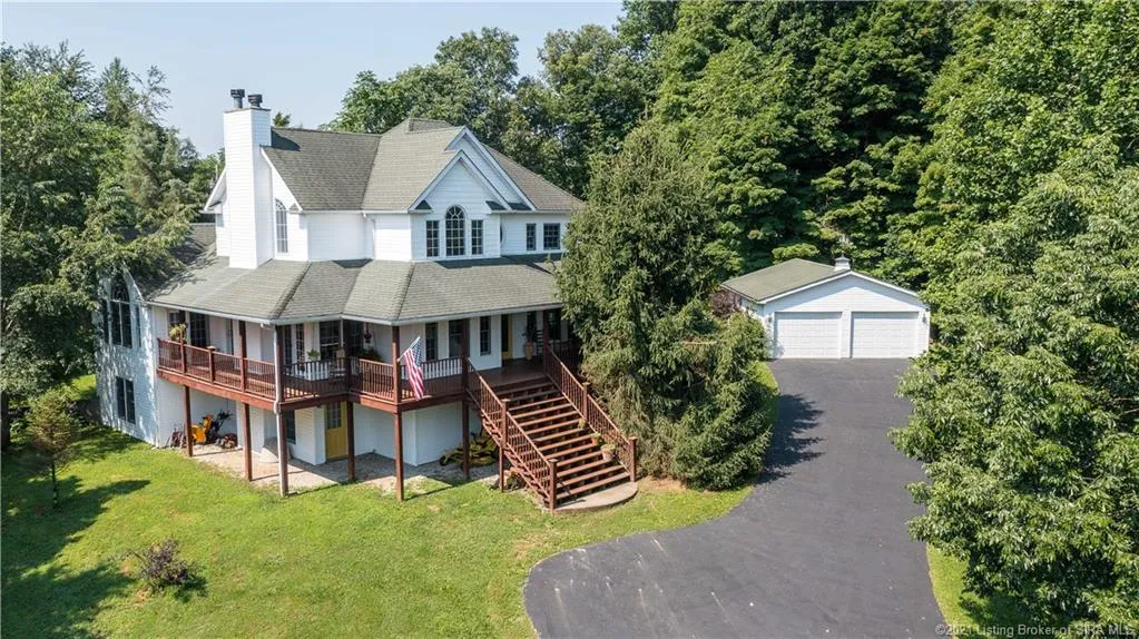 Come home to seclusion and beauty in this three story custom built home. The paved driveway, manicured lawn, koi pond, and mature trees invite you to leave all of your cares behind. Four steps up to the rear entry door you are on the second level where the deck wraps around three sides of the home providing multiple entry points. Inside the spacious living room, with its 24' vaulted ceiling, is full of light and warmth from the french doors and wood burning fireplace, and is also open to the dining room. Three quarter inch thick golden ash hardwood and handmade stained glass pieces are highlights throughout the 2nd level. Wake up to the dawn of a new day in the main bedroom with its large palladium window and take your morning beverage outside to the wrap around deck to watch the sunrise. The kitchen will be your next stop where you will appreciate the extra cabinet space in the island and the breakfast nook for an "eat in kitchen" experience . The first floor offers more space for recreation and entertaining that also includes two bedrooms, a full bath, and a large walk in closet. The third floor hall way provides a stunning view of the living room below and is home to two bedrooms and a full "jack 'n jill" bath. The detached garage offers added depth for work benches. The 5.632 acres gives you plenty of room to explore and enjoy living a bit off the grid. Sq ft & rm sz approx.