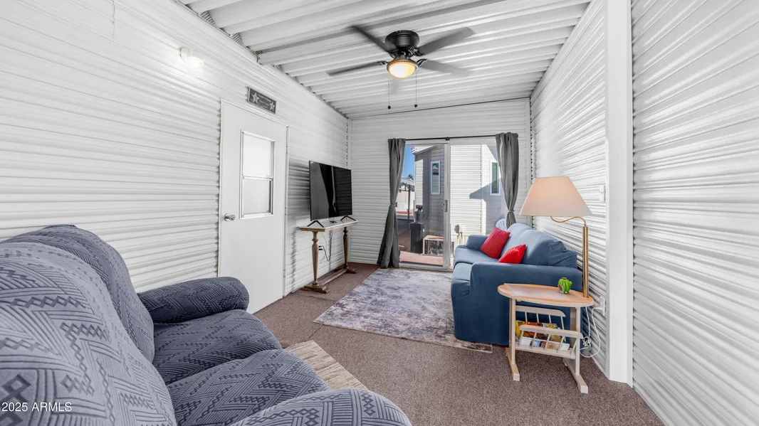 Step right into this Golden Vista charmer where the fun begins before you even reach the front door thanks to a spacious outdoor deck with brand new carpet & railing that practically begs you to sit down, sip something delicious & brag to your friends about the weather. The entire exterior was freshly painted, the new shingled roof is ready to impress & the storage game is strong with pull out drawers under the home including two shiny new ones that are ready for all the things you swear you will organize someday. Head inside to vaulted ceilings with zero popcorn in sight, new ceiling fans, new light fixtures & wood look laminate flooring throughout that makes the whole place feel extra polished without requiring you to become a professional floor cleaner. The kitchen is wonderfully open with a full sized ceramic top stainless steel stove, updated painted cabinets with new hardware & plenty of cabinet space for snacks, gadgets or those random souvenir cups you refuse to let go of. Enjoy the perks of a new forty gallon water heater, water softener & brand new plumbing throughout which means fewer surprises & more relaxing. The casita is the perfect little getaway for guests complete with a cozy bed, half bath & stacked washer & dryer so company can do their own laundry which honestly should be a requirement everywhere. Thanks to the newly added fifth wall & new back door you can live indoors or outdoors in just about any weather which is exactly why this place feels like the crowned jewel of resort living. Add in Golden Vista's amazing amenities, endless activities, friendly neighbors & true resort style atmosphere & you just might find yourself wondering how you ever lived without your own outdoor living room.