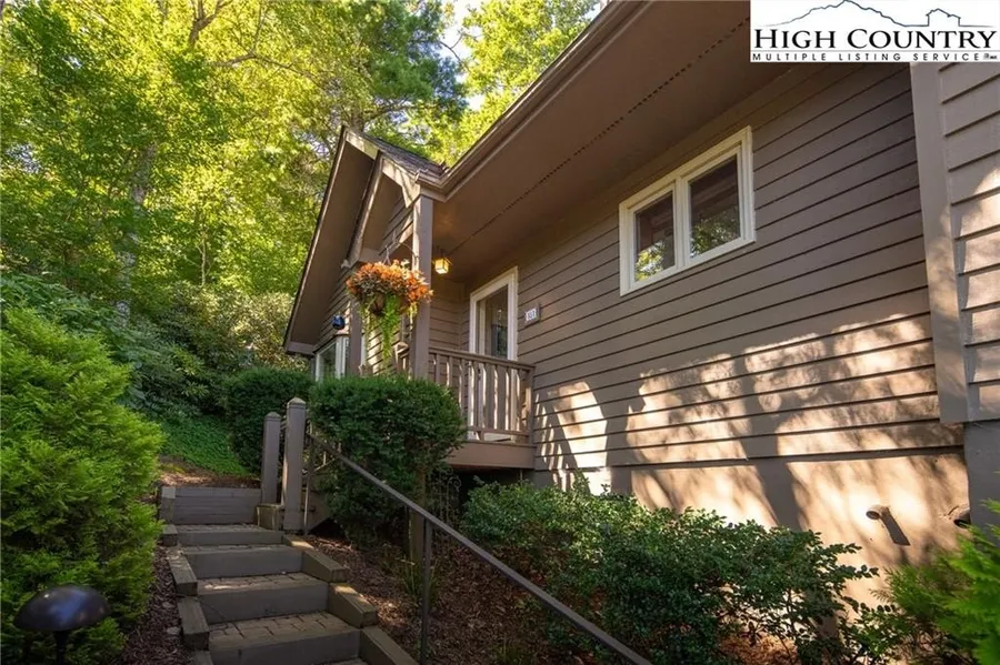 Delightful and spotless contemporary home tucked into rhododendrons and treetops in a beautiful small subdivision in the village of Blowing Rock. Lovely view across the village to Grandfather Mountain, Flat Top Manor, and Cone Estate. Open floor plan, sunny and bright, with generous sized and well-equipped maple kitchen, vaulted great room with stone fireplace and gas logs. Wonderful covered porch, great hot tub deck, plus patio fireplace. First floor is light and bright, with vaulted ceiling, great room, primary suite, laundry, 2 guest rooms and hall bathroom. Lower level has convenient side entrance and mud room, and a 2-car tandem garage with electric car charging station. Fully furnished including linens and kitchenware, plus patio and deck furnishings.