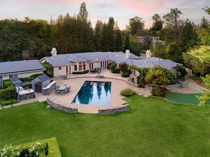 Idyllic indoor-outdoor Monte Sereno living with spectacular backyard. Ideal for entertaining on a grand scale or hosting casual pool parties/BBQs. Over 1 acre, primarily flat lot on quiet cul-de-sac. Gorgeous, panoramic hill views. Open concept kitchen-family great room with large breakfast area overlooking property. Home theater/game room with bar and wine closet. Wonderful primarily 1-level floorplan with 4 of 5 bedrooms en suite. Spa-like primary suite with romantic fireplace, naturally bright shower enclosure, deep-soaking tub, walk-in closet and two walk-out patios. Large pool and spa, outdoor fireplace, outdoor kitchen. Expansive backyard includes spacious lawn, sport court, bocce ball court, putting green, and a vineyard. Solar system for home. 3-car garage with extra large driveway for guests.