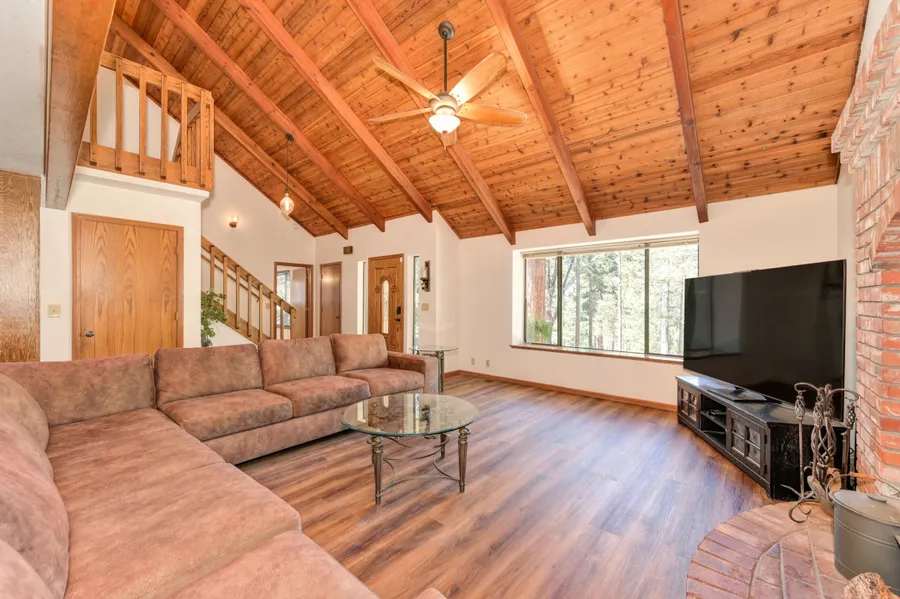 Nestled amidst picturesque mountains, this stunning residence epitomizes tranquil living with its park-like setting. A grandeur awaits as you step inside, greeted by high vaulted open beam ceilings that elevate the ambiance of the great room, complemented by a captivating fireplace that beckons cozy gatherings. The allure continues with the primary bedroom conveniently located on the main level w/ensuite bath which includes separate tub & shower, offering a retreat-like experience. Ascend upstairs to discover three generously sized rooms, each exuding spaciousness and comfort. Indulge in culinary delights with the stunning kitchen featuring a huge island w/prep sink, stainless appliances, large farmhouse sink, an abundance of sleek quartz counters, quality cabinetry along w/a full tiled backsplash. Enjoy meals within the circular dining & breakfast room, offering panoramic views of the patio & open backyard area, creating a seamless indoor-outdoor flow perfect for entertaining or quiet reflection. Equipped with modern conveniences, including brand new vinyl plank flooring, a whole house generator, all interior & outdoor furniture, this home effortlessly combines luxury & functionality. Don't miss the opportunity to witness the splendor of this remarkable residence! A GREAT VALUE!
