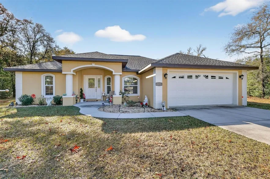 Welcome to this beautifully designed ALMOST NEW 3-bedroom, 2-bath home offering an open floor plan and a peaceful country setting on 1.05 acres. Each bedroom features elegant tray ceilings, adding architectural charm throughout. The spacious kitchen is the heart of the home, complete with a granite island and a stunning picture window that frames tranquil outdoor views perfect for enjoying the surrounding nature. The primary suite is a true retreat, featuring tray ceiling and sliders that open to the lanai, a large walk-in closet. The ensuite bath has a spacious master shower, and a double vanity. Triple sliders extend from the master bedroom to the extended lanai, creating seamless indoor-outdoor living. Additional highlights include inside laundry with a laundry tub, stackable washer and dryer, and a pantry for added storage. Both guest bedrooms have tray ceilings as well. Enjoy the convenience of a pedestrian door in the garage, a water softener, and an extended lanai ideal for relaxing or entertaining. Located with easy access to Ocala and Dunnellon, this home offers the perfect blend of comfort, functionality, and serene country living. This property comes with private access to Rainbow River for Rainbow Springs home owners There is also a clubhouse, pool and tennis courts!