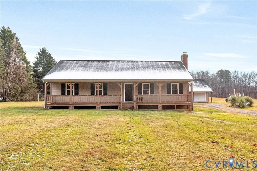 Welcome to this charming ranch-style home nestled on just under 3 acres, offering the perfect blend of comfort, privacy, and space. This well-maintained three bedroom, two bath property features an inviting open floor plan. The spacious eat-in kitchen boasts a breakfast bar, stainless steel appliances, and flows seamlessly into the cozy living room highlighted by a gas fireplace. A dedicated dining area opens to the covered back porch-ideal for relaxing or entertaining while enjoying the peaceful surroundings. The primary bedroom includes a walk-in closet and private full bath for added convenience. Additional features include replacement windows and a 2-car detached garage, providing ample storage and workspace. Whether you are looking for plenty of open space to create your dream garden or to unwind and take in the serene surroundings- there is something for everyone to appreciate. Don't miss this wonderful opportunity to experience one-level living on a beautiful, expansive lot in the heart of Hanover County!