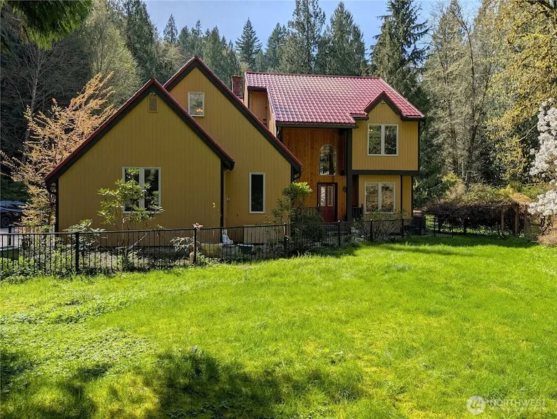 Behold! Your SANCTUARY! Beautiful trees, a bridge leading to a pond that feeds into the Stillaguamish River, deer prancing in the background. Plenty of water for gardens galore on this 5+ acre property with a one-of-a-kind storybook home. Enter into soaring vaulted ceilings w/ a spacious floor plan which creates an airy feel. The impressive living room opens into an enclosed cedar porch with the large windows making nature the focal point. Primary bedroom occupies the upper left wing & leads to a private deck. Additional building with power could be turned into an ADU. Lower level of the property has water spigot & is ready for an additional shop/garage. Access to river & just minutes from DT Arlington!