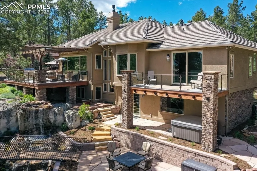 STUNNING CONTEMPORARY COLORADO LIVING! This is your DREAM HOME. Completely renovated rancher with walk-out basement on a unique double lot of 1.3 acres that backs up to Woodmoor open space. Enter this gorgeous home with custom woodwork throughout from beamed 12' ceilings and 8’ custom doors and trim, to designer cabinetry and stylish, modern lighting fixtures and chandeliers. Power window shades on upgraded massive windows in the great room adds natural light and views of Pikes Peak. The well-appointed kitchen with custom Plush Design cabinetry includes double ovens, built-in cabinet depth microwave, prep sink plus an extra deep sink, beverage refrigerator, Bosch 5 burner gas cooktop is a chef's dream. An added "pantry room" and laundry area is adjacent to this amazing kitchen. Custom designed walk-out basement has 4 Bedrooms including a junior guest suite with fireplace and a fully equipped wet bar with wine frig, microwave and sink with Eden Oak handcrafted cabinetry. Main level's pimary suite has a walk out private deck and office with more views. There are two gas fireplaces on the main level with custom leathered marble surround and two electric fireplaces in the lower level. Furnace and 2 tankless water heaters were replaced in 2021. Heated floors warm the primary and guest suite bathrooms and front porch. Additional features include central vacuum, radon mitigation and sump pump. Insulated garage doors with new openers were installed in 2024. Views of Pikes Peak from numerous decks, patios and seating areas include a 32’ X 24” tiled deck with pergola that walks out from main level, making the outdoor living spaces ideal for entertaining. Custom landscaping surrounds this gorgeous property with two waterfalls, a generous turf lawn, a bocce ball court, two gazebos, built-in propane fire pit, fully automated watering system and an electric fence for dogs. This home is an absolute BEAUTY in a SERENE SETTING!