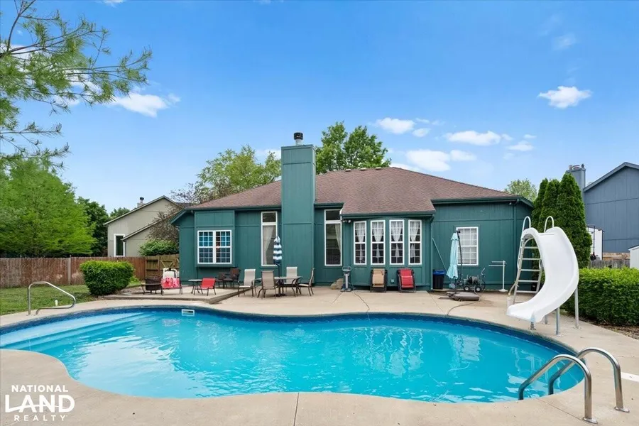 Welcome to this desirable 4-bedroom, 3-bathroom Ranch home located on a serene cul-de-sac with majestic trees to provide cool shade and color-changing leaves for picturesque moments. Relax in a refreshing saltwater pool, offering an array of benefits and no strong chlorine smells providing the added convenience of reduced maintenance. With fresh exterior paint, new roof, new AC unit, and new water heater, this property is ready for you to make your new home! The oversized primary bedroom has grand cathedral ceilings for an estate feeling and extended double sinks in the primary bathroom provide ample counter space. The whirlpool tub, walk-in shower, and walk-in closet will be a cozy cove to enjoy. The fully finished basement showcases a remarkable full wall built-in and entertainment bar to grab quick refreshments, while the generous fourth bedroom offers an additional space perfect for crafting or play.