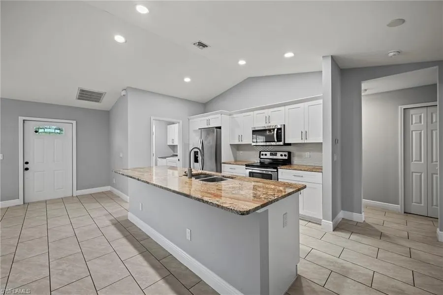 4 Bedroom concrete block construction home built in 2018 offering an updated kitchen with stainless steel appliances granite countertops and plank tile flooring throughout main living area and master bedroom with carpet in the 3 guest bedrooms. Brand new interior paint completed on all baseboards, trim, doors and walls! Stunning master bathroom complete with duel sinks and designer tile finish in the large step in shower. Brand new water heater installed in October 2025 and Water softener system in late 2024. Out back enjoy a spacious screened in lanai and a large private back yard! NO HOMEOWNER'S ASSOCIATION FEES. This home is located within one of the most prime and desirable locations in all of Southwest Florida! 1-2 miles away from the popular Three Oaks Park, Three Oaks Middle School, San Carlos Park and Three Oaks Elementary Schools. Short Drives to RSW International Airport, Gulf Coast Town Center, FGCU, Miromar Outlets, Hertz Arena and Coconut Point Mall.