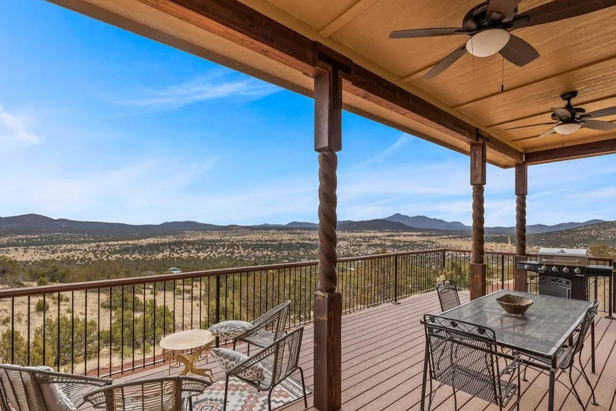 Stunning panoramic views and amazing privacy awaits you! On a 13.73 acre lot this hillside home is bathed with southern exposure! Passive solar can add to your comfort in winter and at 6,900 feet of elevation (with AC) adds to your summer enjoyment. When entering the home, you will be enveloped by natural light and with 22-foot-high ceilings (12-feet in bedrooms) the home feels spacious. Extraordinary details such as concrete flooring, raw edge Mesquite wood fireplace mantle, Granite Moon White countertops in the kitchen, stainless-steel appliances, tons of custom cabinets and beautiful tilework in each bathroom. The exterior is Stucco (synthetic), hand-carved Santa Fe turned wood posts and sunbursts above the windows, clay tiles and metal roof and an absolutely amazing deck for viewing wildlife, Kaibab and BLM National forests. The deck is the perfect place for stargazing, sunrises and sunsets, what great photographs you can take! There are 4 separate RV hookups, one which is in the huge pull-thru garage (11ft high aluminum and Lexan glass doors) park a trailer inside and make a wonderful extra bedroom! This central location is 15 mins to the charming historic Rt 66 town of Williams, 40 mins to the Grand Canyon, 30 mins to Flagstaff and in the middle of all that Northern AZ offers!