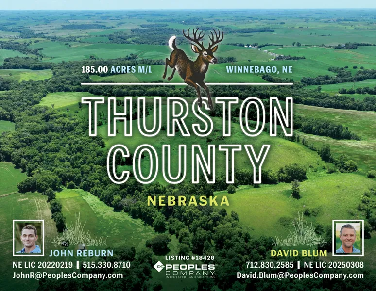 Peoples Company is proud to offer 185 acres m/l of premier hunting and income-producing land in Thurston County, Nebraskajust 4.5 miles southeast of Winnebago. This diverse property blends fertile tillable ground, CRP habitat, and thick timbered draws surrounding North Blackbird Creek, making it a magnet for mature whitetails.