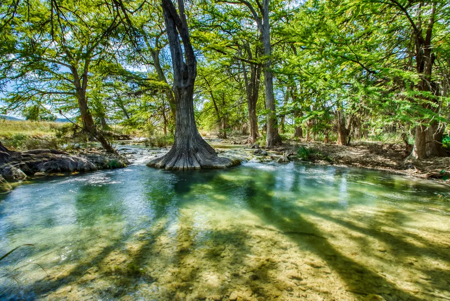 The river frontage is a stunning hidden gem with over 1300+ feet of sparkling river, pecan groves and majestic cypress trees some of the largest in the area. Axis and wildlife love this river bottom and the previous owner was able to harvest many to fill the freezers. There are too many features to describe this gorgeous property. It's truly a piece of Texas Hill Country Haven!