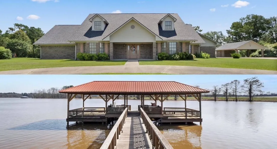 This 1 1/2 story home boasts a spacious 4700 sq ft+/- of living area on 1.8 +/- acres of waterfront property. With 5 bedrooms and 2 1/2 baths this home features 2 en-suite master bedrooms, formal dining, formal living with cathedral ceiling and wood burning fireplace, recreation room and a spectacular sunroom to enjoy your morning coffee and beautiful sunrises. Modernized with stunning granite and quartz countertops, luxury vinyl plank flooring, and stylish lighting fixtures, this home offers a perfect blend of elegance and contemporary comfort. The study provides entrance to the 2nd floor living space which can be utilized to accommodate additional guests. The manicured grounds offer abundant space for outdoor entertainment and relaxation. Enjoy lake living with your very own concrete boat launch, fishing pier and 2 oversized metal covered sheds for all your outdoor sporting needs. In addition to the 2-car garage there is also a detached 2 car carport with a full bath. A rare find in a prime location this home is within minutes of town amenities. Whether you're seeking a permanent residence or weekend getaway this one has it all. Bring your friends, fire up the BBQ and immerse yourself in the tranquil beauty and endless recreational opportunities that lake life has to offer.